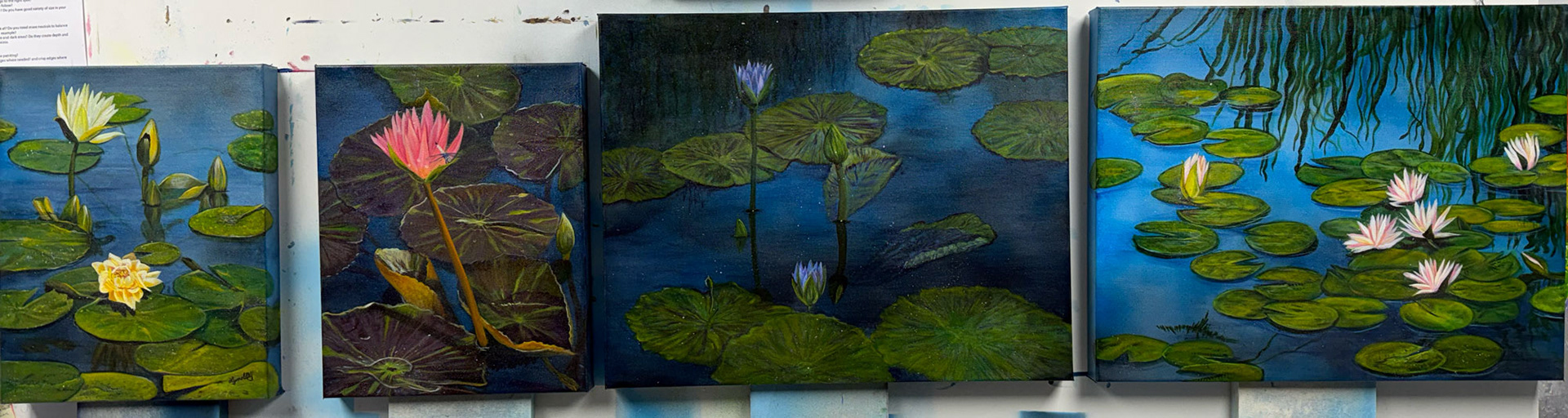 Water Lily One & Two (11x14 painting on 1.5" gallery canvas) Water Lily Three & Four (16x20). I need one more oil paint layer on the purple #4 water lily. *Finishing these after setting aside for my botanical animals! (Dragonia/dragon angel wing begonia)
